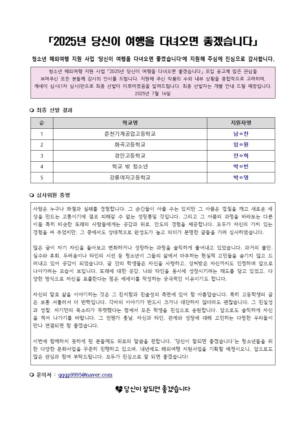 이번에 함께하지 못하게 된 분들께도 위로의 말씀을 전합니다. ‘당신이 잘되면 좋겠습니다’는 청소년들을 위한 다양한 문화사업을 꾸준히 진행하고 있으며, 내년에도 해외여행 지원사업을 기획할 예정이오니, 앞으로도 많은 관심과 참여 부탁드립니다. 모두가 진심으로 잘 되면 좋겠습니다!