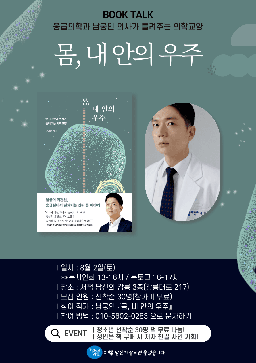 남궁인 작가의 따뜻한 의학 교양서, 『몸, 내 안의 우주』가 전할 다정한 울림과 함께, 이번 행사가 몸과 마음에 대한 깊은 이해를 선물하는 소중한 기회가 되기를 바랍니다.😊