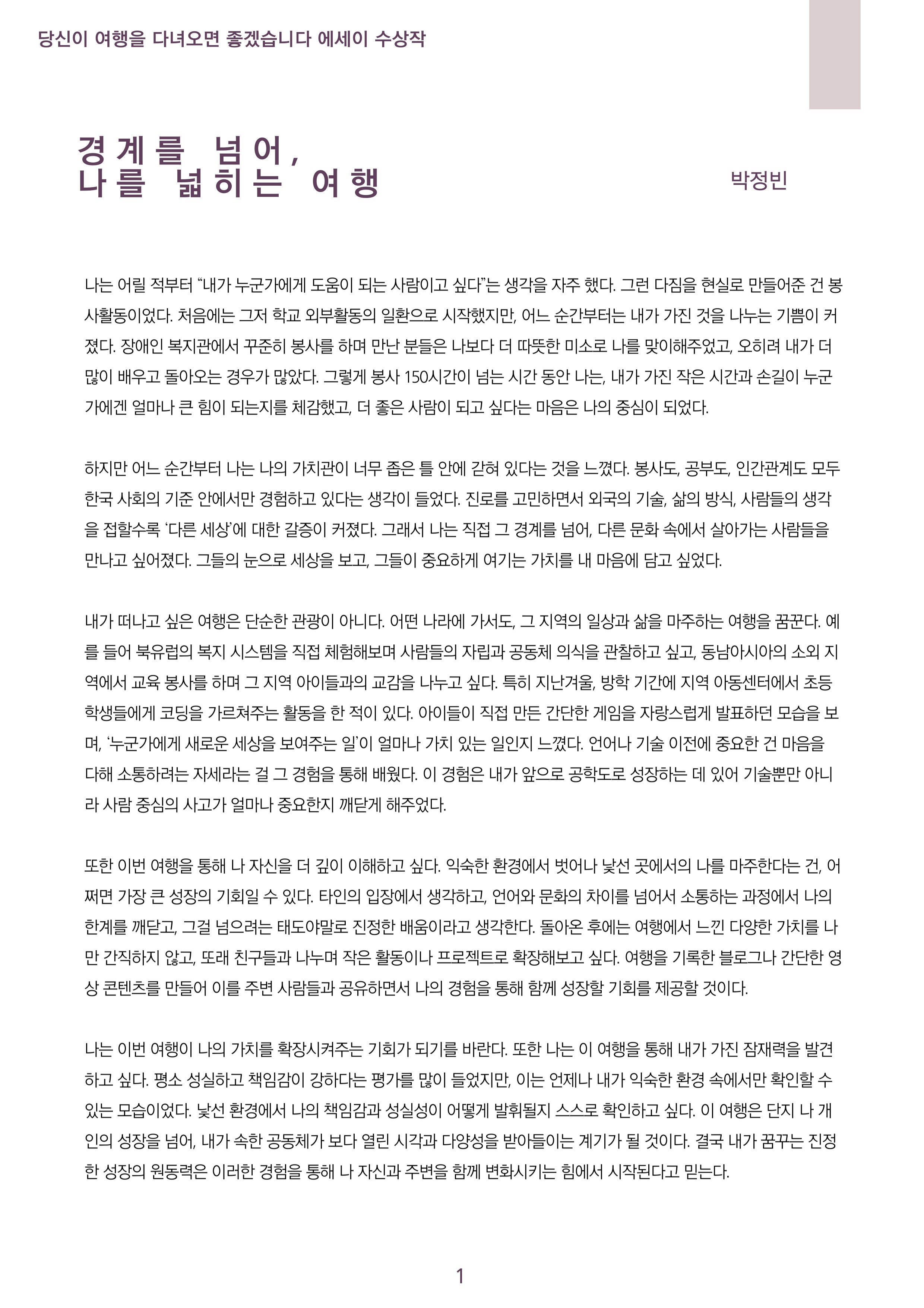 2025 당신이 여행을 다녀오면 좋겠습니다 수상작 「경계를 넘어, 나를 넓히는 여행」