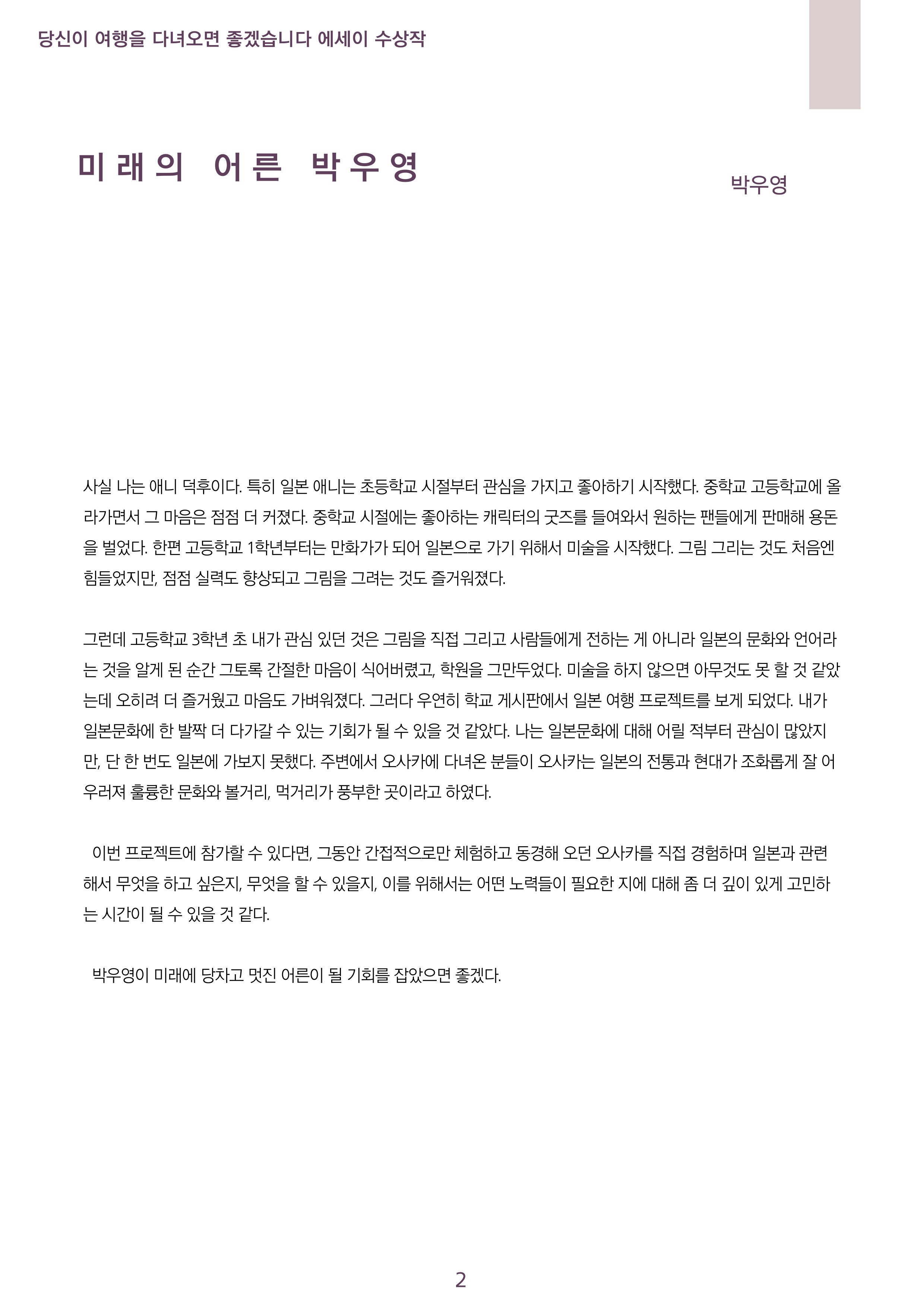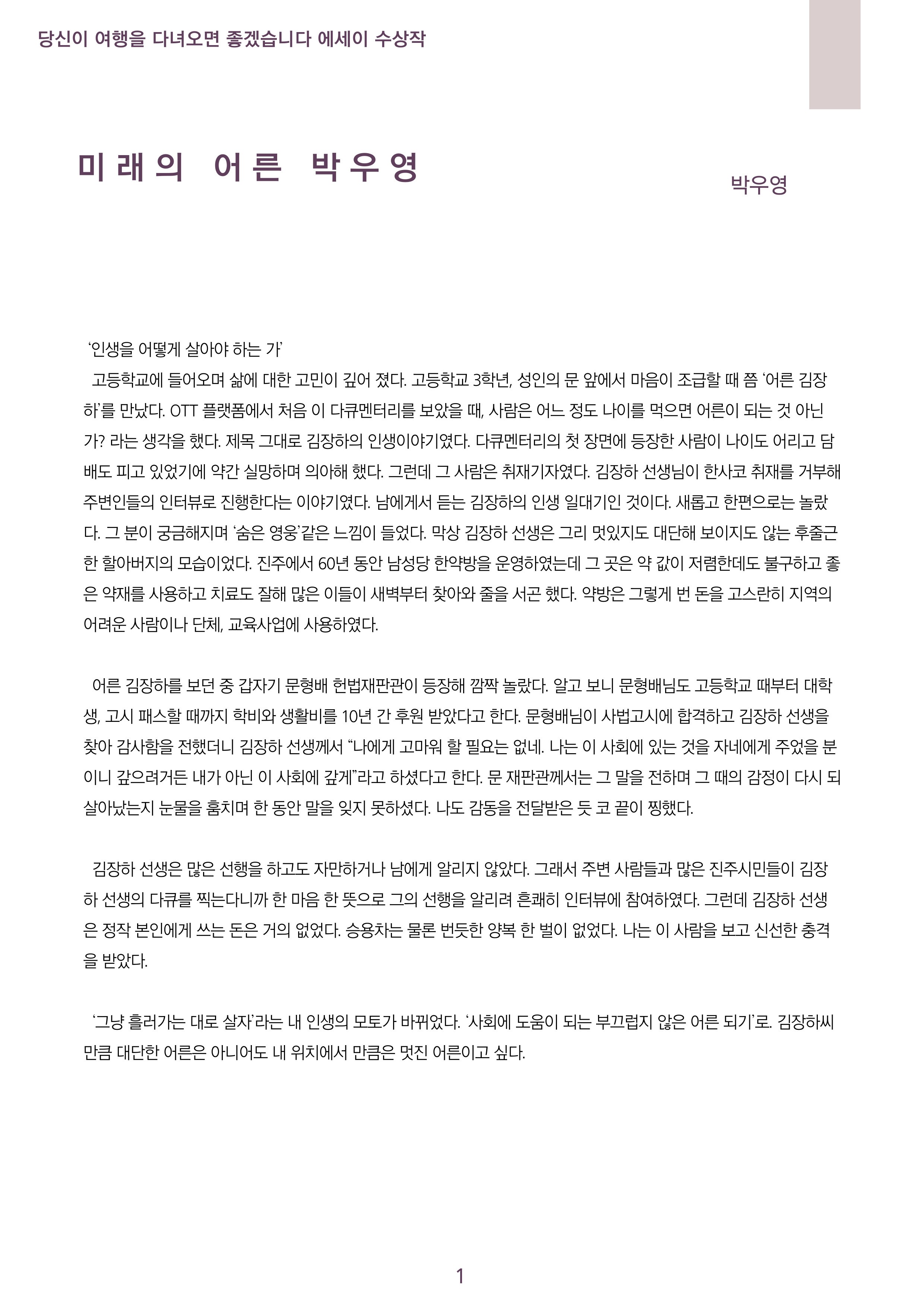 2025 당신이 여행을 다녀오면 좋겠습니다 수상작 「미래의 어른 박우영」