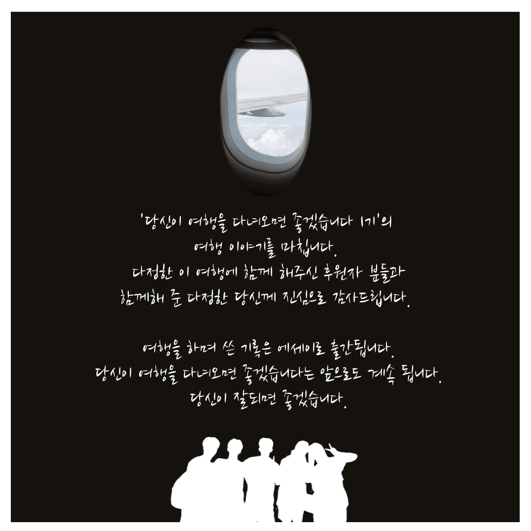 “무사히 잘 귀가했습니다! 물심양면으로 후원해 주시는 모든 분들 덕분에 감사하게도 넓은 세상을 경험하면서 많은 걸 느끼고 돌아온 시간이었습니다. 고민을 한아름 안고 떠난 제가 잡념없이 행복하게 즐기다가 조금이지만 성숙해져서 일상으로 복귀할 수 있게 만들어주셔서 감사드리고, '당신이 여행을 다녀오면 좋겠습니다'의 1기로 다녀올 수 있어서 정말이지 좋았습니다. 모든 여정을 함께해주신 다정하고 살가운 선생님들과 친구들에게 고맙다는 말을 전합니다!”