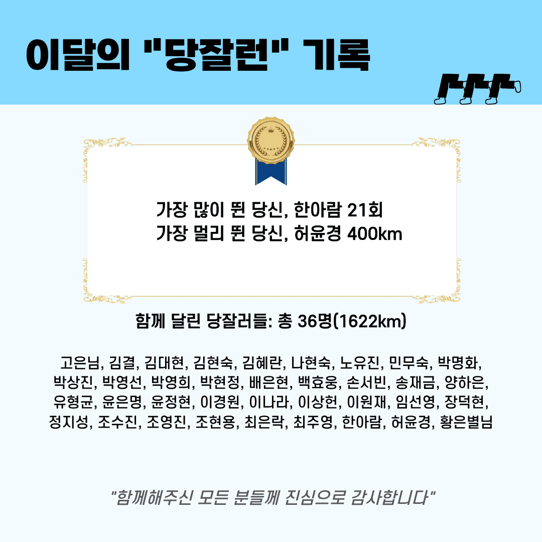 -함께 달린 당잘러들: 총 36명(1622km) (고은님, 김결, 김대현, 김현숙, 김혜란, 나현숙, 노유진, 민무숙, 박명화, 박상진, 박영선, 박영희, 박현정, 배은현, 백효웅, 손서빈, 송재금, 양하은, 유형균, 윤은명, 윤정현, 이경원, 이나라, 이상헌, 이원재, 임선영, 장덕현, 정지성, 조수진, 조영진, 조현용, 최은락, 최주영, 한아람, 허윤경, 황은별님)