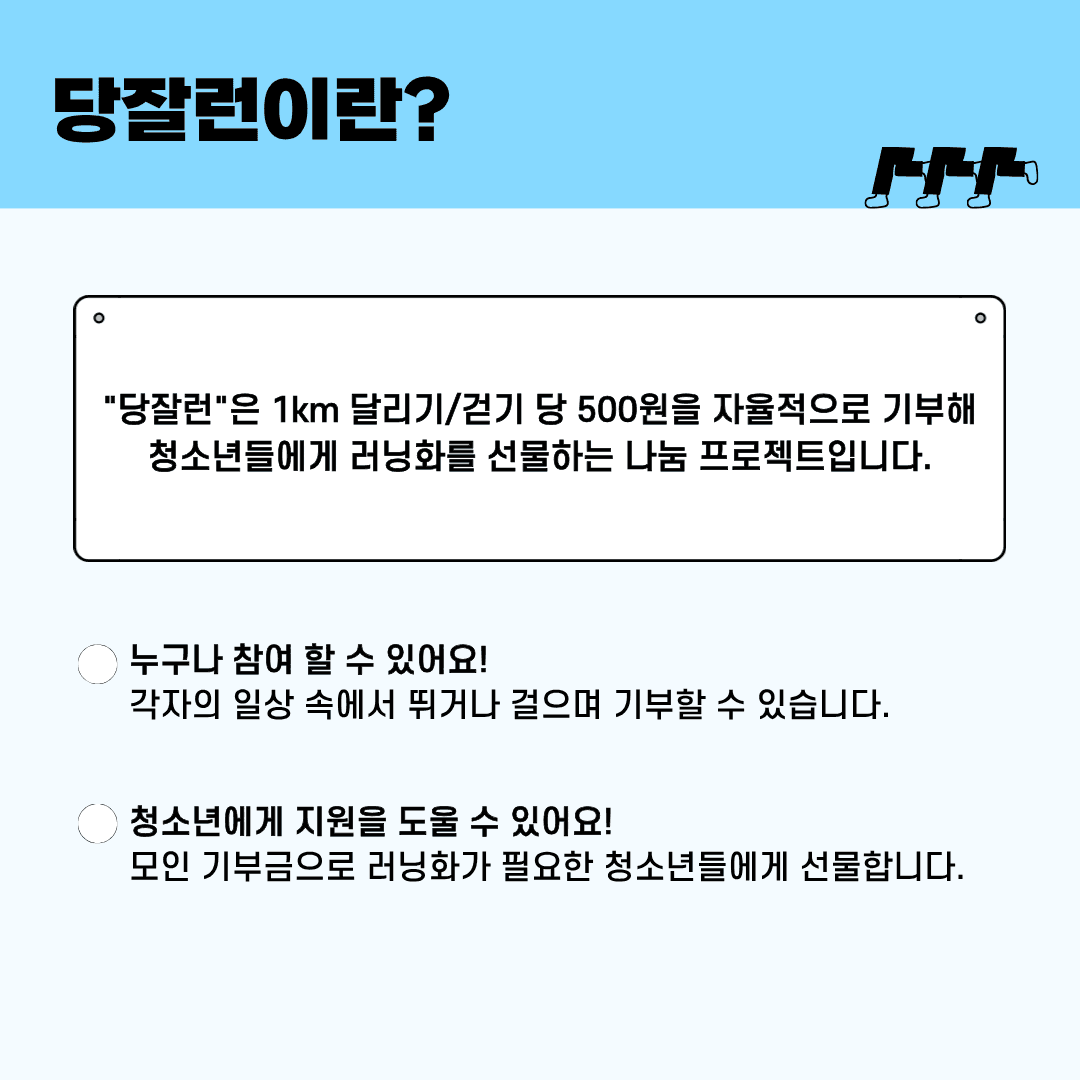 "당잘런"은 1km 달리기/걷기 당 500원을 자율적으로 기부해, 청소년들에게 러닝화를 선물하는 나눔 프로젝트입니다 💨