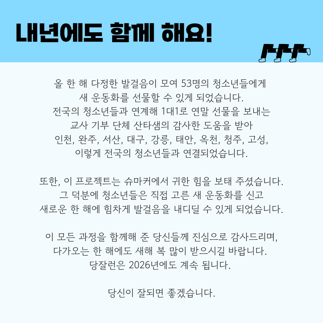 1년 동안 걷고 뛰며 모인 모금액으로 53명의 청소년들에게 새 운동화를 선물하게 됩니다.