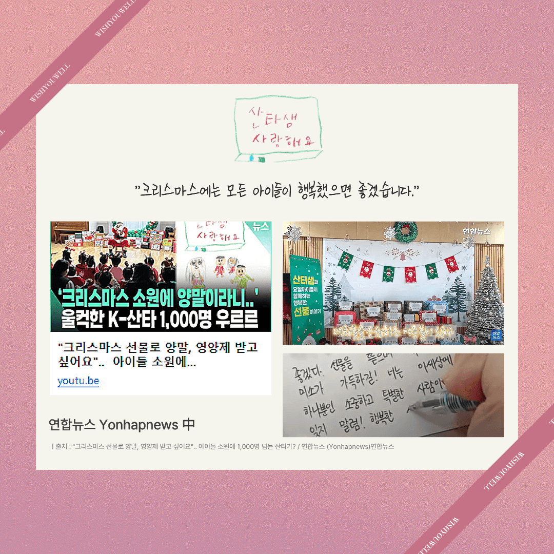 이 특별한 이야기는 연합뉴스에서도 소개되어 많은 사람들에게 감동을 주었는데요, 자세한 내용은 유튜브에 '산타샘'을 검색하면 연합뉴스의 영상으로 만나볼 수 있습니다 🎥