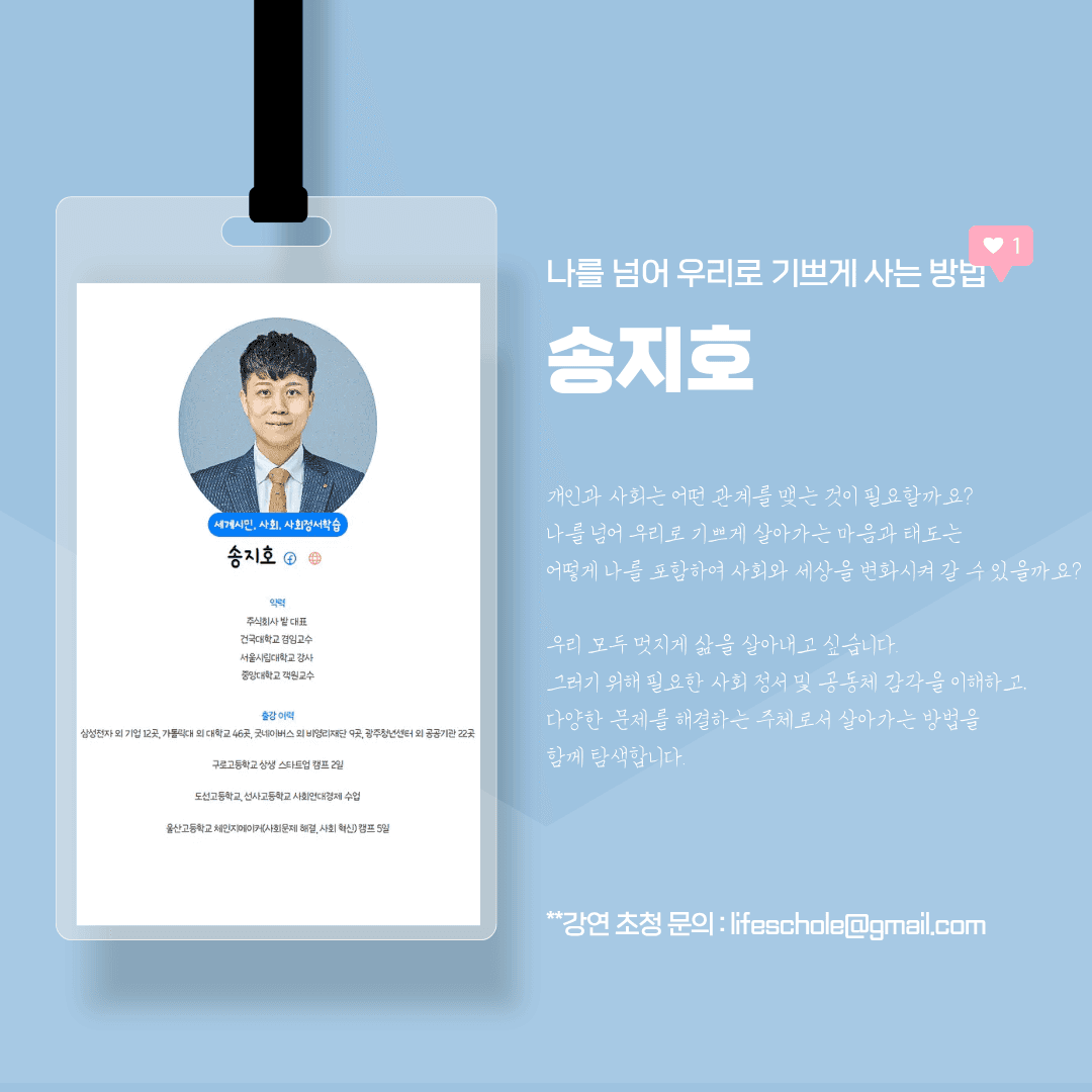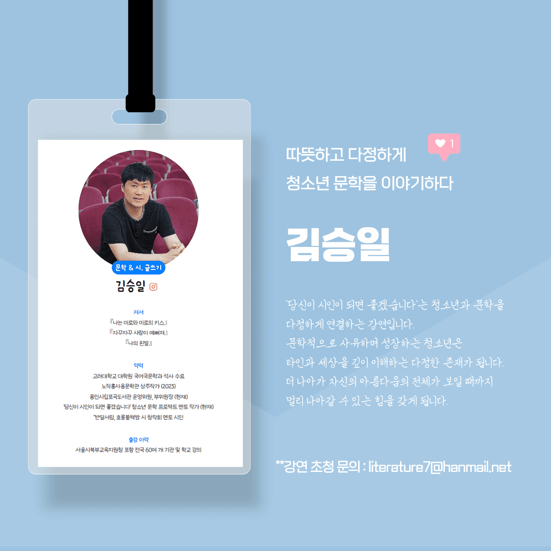 청소년들의 눈높이에 맞춘 성장 이야기부터, 청소년들을 바르게 이끌어주는 일에 종사하는 어른들에게 필요한 강의까지, 다양한 주제로 여러분을 찾아갑니다.
