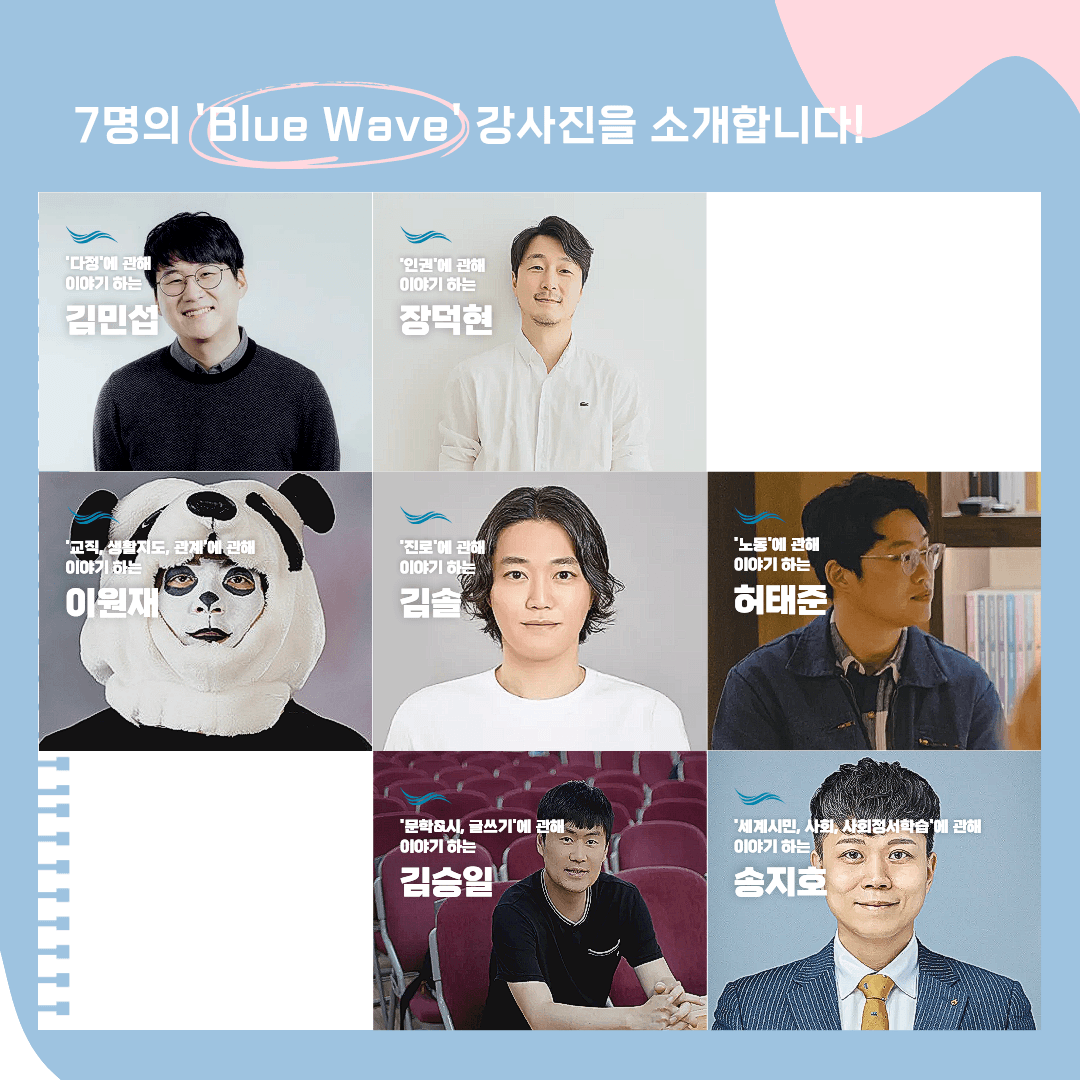 청소년 강의 브랜드 [Blue Wave]는 김민섭 작가님과 함께하는 7명의 강사진으로 구성되어 청소년을 위한 '다정, 인권, 관계, 진로, 노동, 시, 사회'에 관한 이야기를 전합니다.