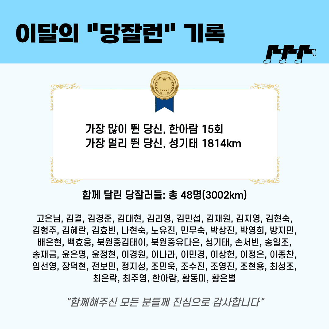 -함께 달린 당잘러들: 총 48명(3002km) (고은님, 김결, 김경준, 김대현, 김리영, 김민섭, 김재원, 김지영, 김현숙, 김형주, 김혜란, 김효빈, 나현숙, 노유진, 민무숙, 박상진, 박영희, 방지민, 배은현, 백효웅, 북원중김태이, 북원중유다은, 성기태, 손서빈, 송일조, 송재금, 윤은명, 윤정현, 이경원, 이나라, 이민경, 이상헌, 이정은, 이종찬, 임선영, 장덕현, 전보민, 정지성, 조민욱, 조수진, 조영진, 조현용, 최성조, 최은락, 최주영, 한아람, 황동미, 황은별님)